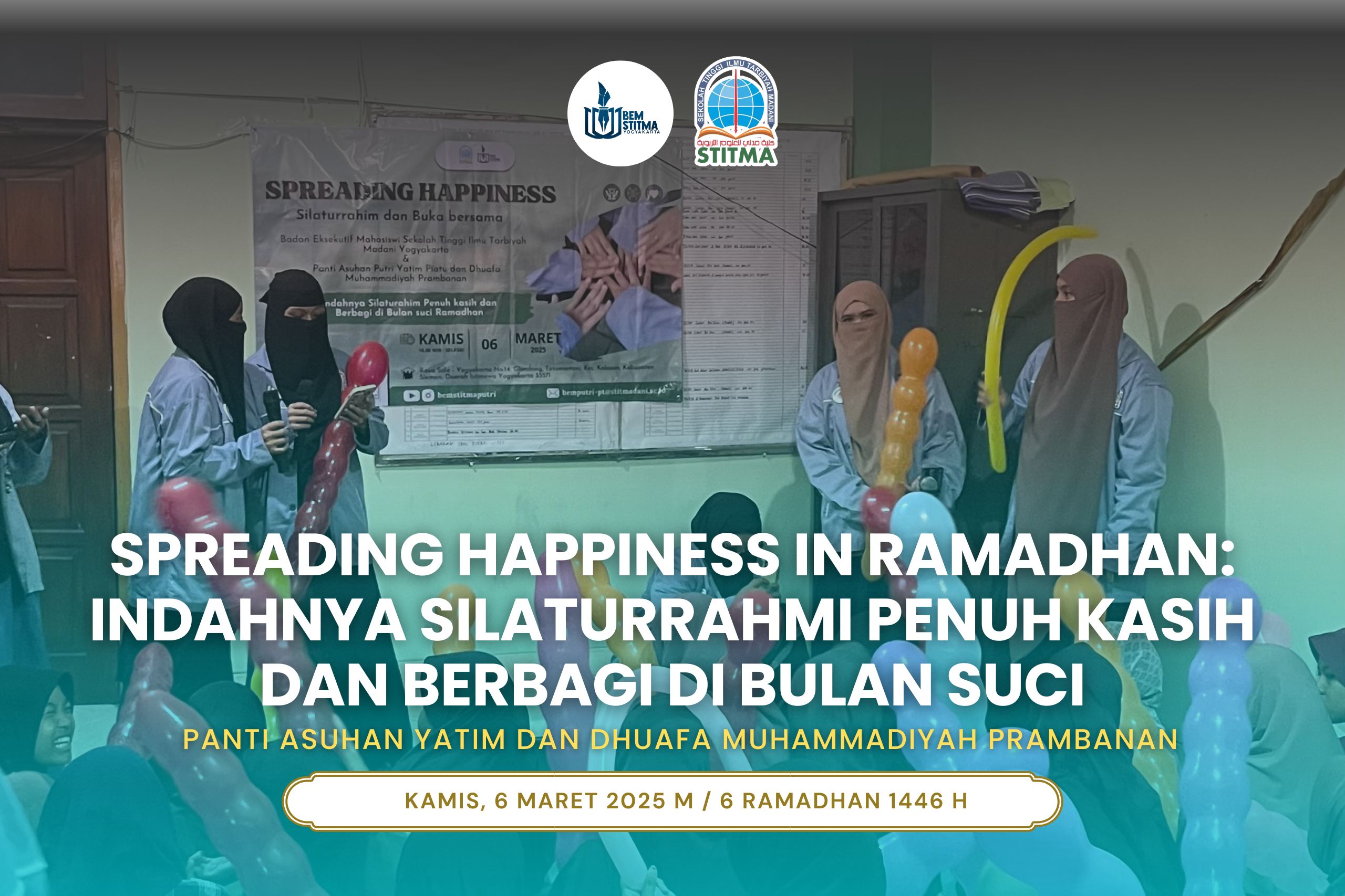 Pada tanggal 6 Maret 2025, Badan Eksekutif Mahasiswa (BEM) Putri Sekolah Tinggi Ilmu Tarbiyah (STIT) Madani melaksanakan kegiatan sosial bertema “Spreading Happiness in Ramadhan: Indahnya Silaturrahmi Penuh Kasih dan Berbagi di Bulan Suci Ramadhan.” Kegiatan ini berupa kunjungan ke Panti Asuhan Yatim dan Dhuafa Muhammadiyah Prambanan Putri sebagai wujud kepedulian sosial dan pengabdian kepada masyarakat.