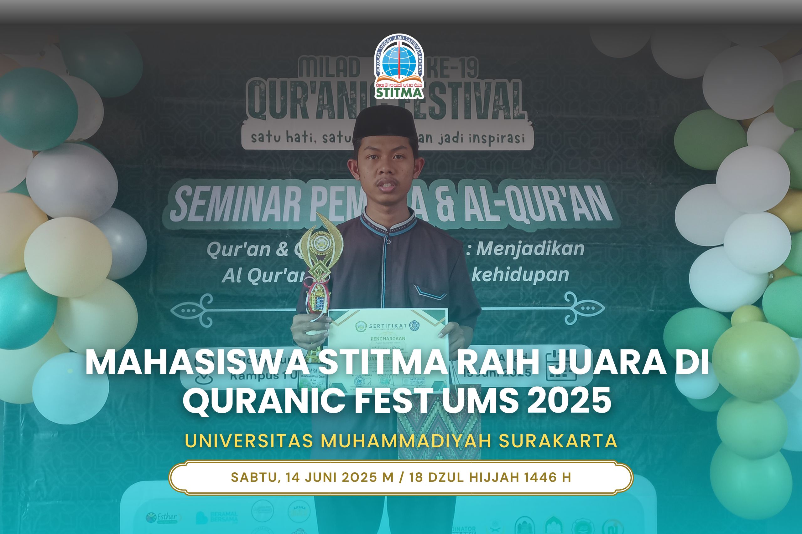 Surakarta, 14 Juni 2025 — Empat mahasiswa STITMA Yogyakarta berhasil menunjukkan semangat dan kecintaan mereka terhadap Al-Qur’an dengan mengikuti ajang bergengsi Quranic Fest 2025 yang diselenggarakan oleh Mahasiswa Pencinta Al-Qur’an Universitas Muhammadiyah Surakarta (MPQ UMS). Dalam ajang ini, Muhammad Raihan, mahasiswa Program Studi Pendidikan Agama Islam (PAI) semester 2, berhasil mengharumkan nama kampus dengan meraih Juara 2 dalam cabang Musabaqah Hifzhil Qur’an (MHQ) 10 Juz.