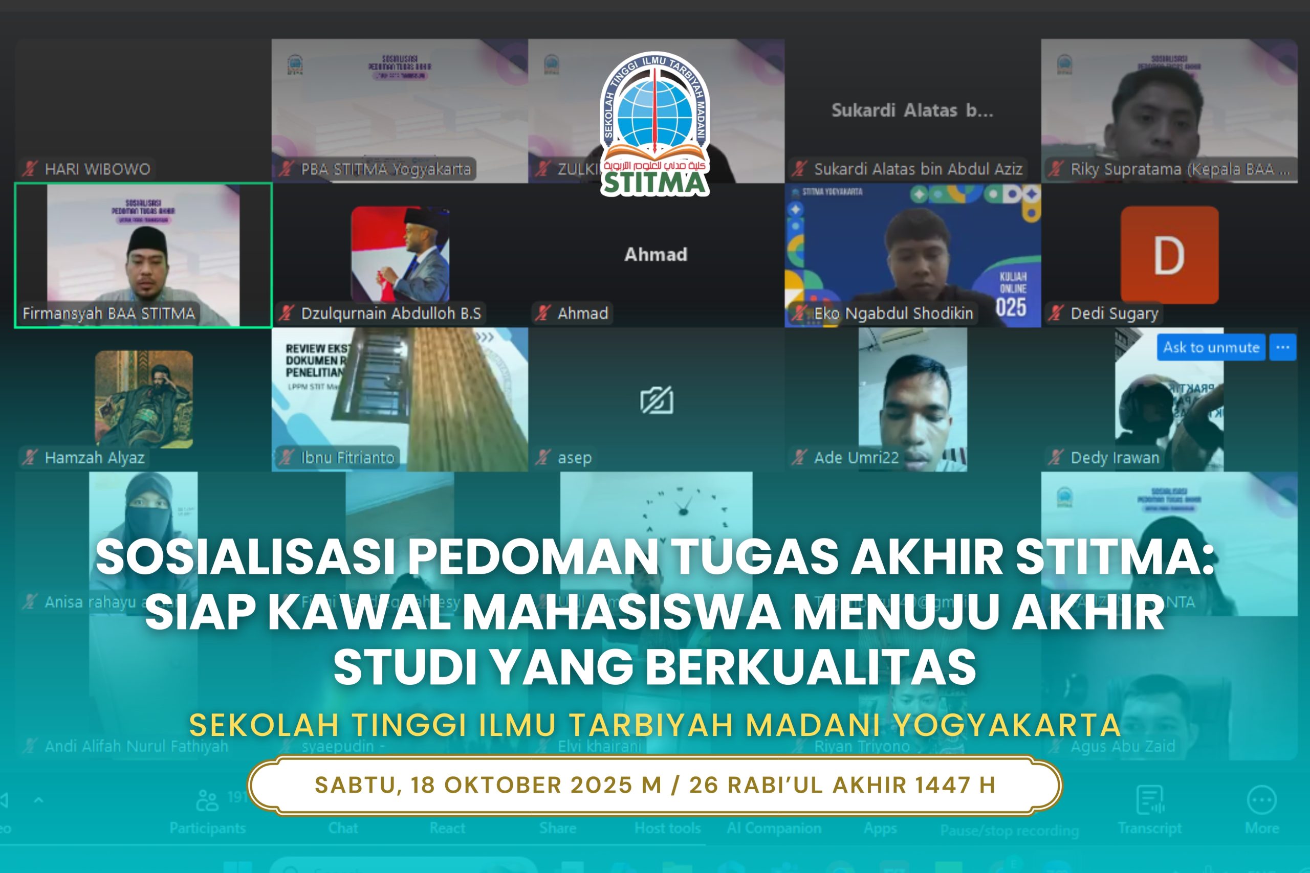 Sabtu, 18 Oktober 2025 – Sekolah Tinggi Ilmu Tarbiyah Madani (STITMA) Yogyakarta menyelenggarakan kegiatan Sosialisasi Pedoman Tugas Akhir bagi mahasiswa semester 5, 7, dan 7 keatas. Kegiatan ini menjadi langkah awal penting dalam membekali mahasiswa dengan pemahaman menyeluruh terkait sistem dan aturan terbaru penyusunan tugas akhir di lingkungan STITMA.