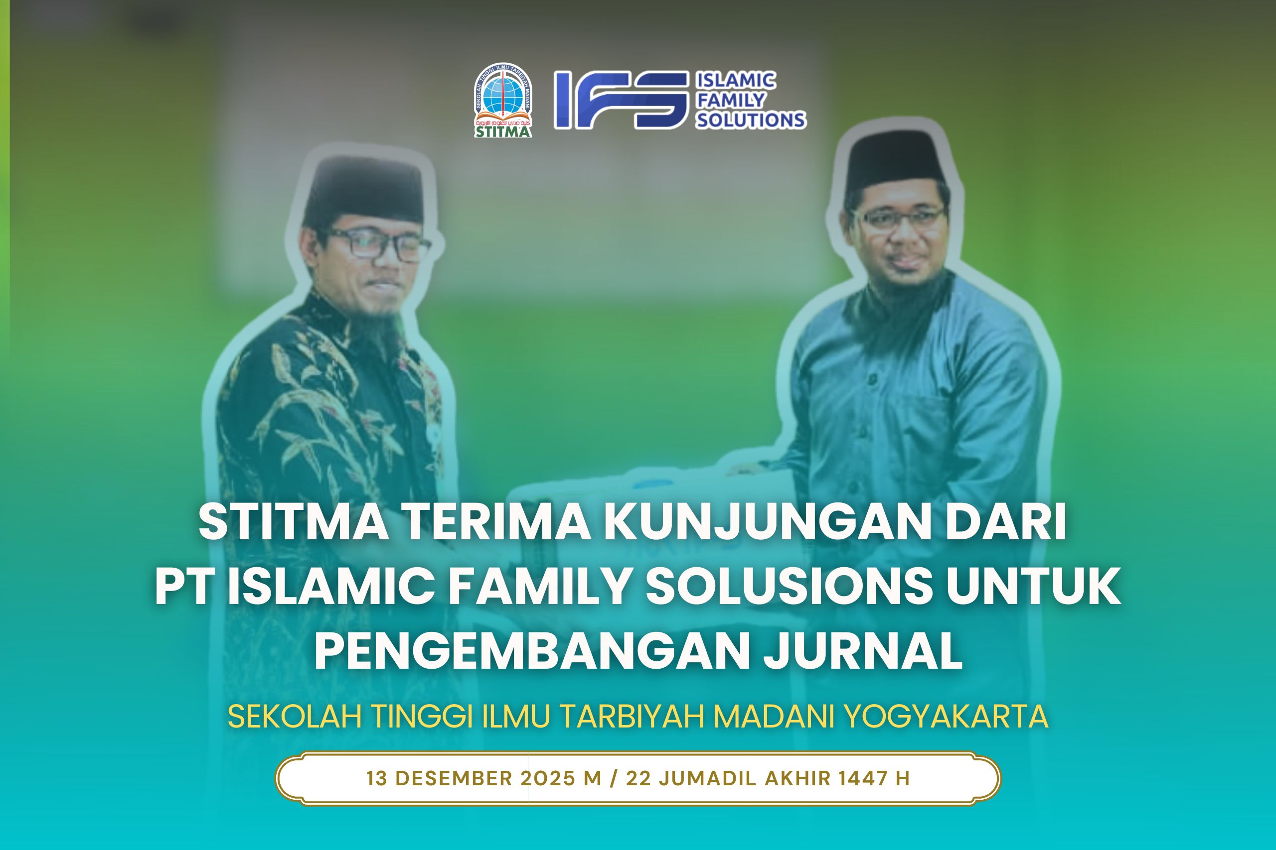 Yogyakarta, 13 Desember 2025 – Sekolah Tinggi Ilmu Tarbiyah Madani Yogyakarta (Sekolah Tinggi Ilmu Tarbiyah Madani Yogyakarta) menerima kunjungan dari PT Islamic Family Solutions (PT IFS) dan Yayasan Solusi Kebaikan Akhirat (SKA) pada Sabtu, 13 Desember 2025. Kunjungan tersebut berlangsung di Ruang Ketua STITMA dan disambut langsung oleh Ketua STITMA Yogyakarta, Amrin Mustofa, S.Ud., M.H.